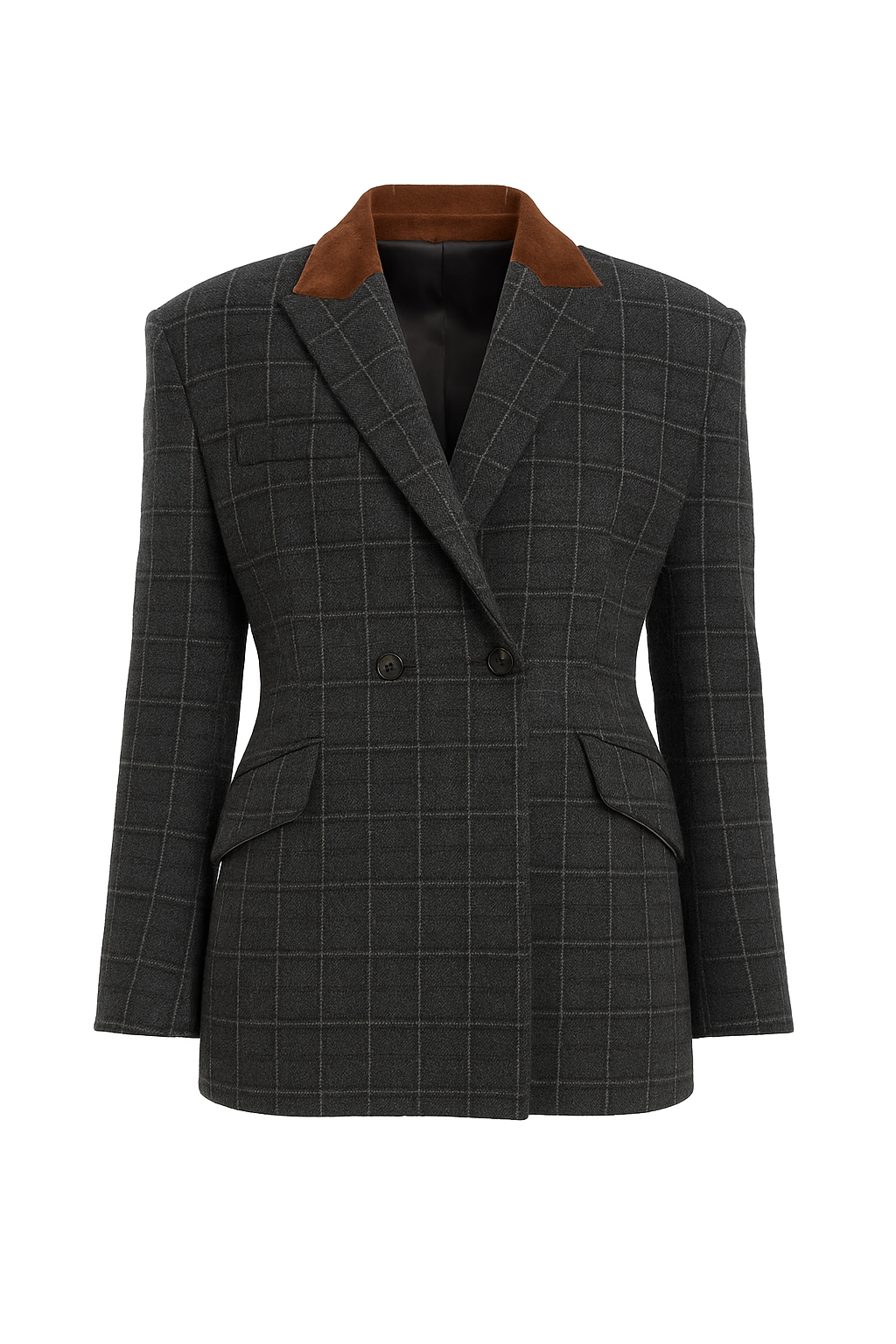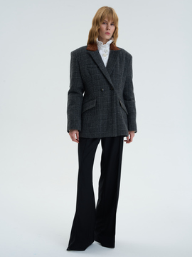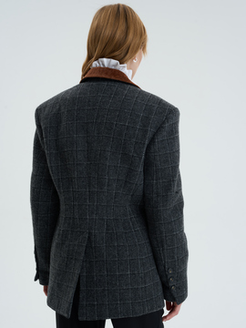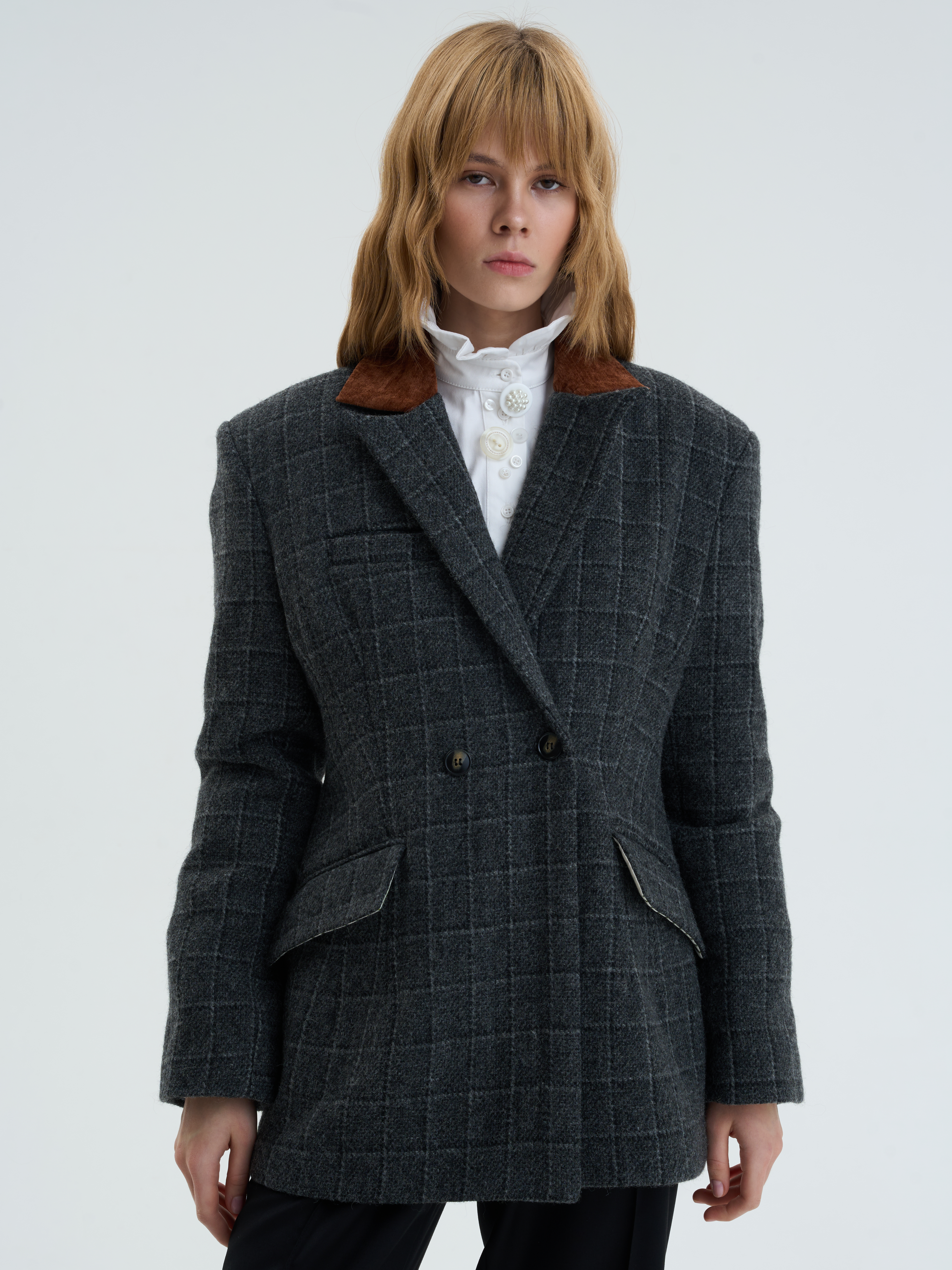 Приталенный жакет оверсайз из шерсти в клетку. Форма строгая, как первый абзац романа, но ткань дышит теплом. Бархатный воротник добавляет акцент, будто закладка в старой книге. Создан для тех, кто видит силу в тишине.